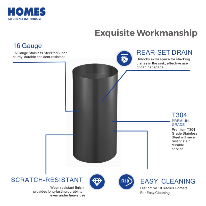 In the category of kitchen furniture, this sink specifically adopts two advanced technologies—Physical Vapor Deposition (PVD) and nano-coating—to further enhance its quality and practical performance, providing unparalleled protection for daily kitchen use.