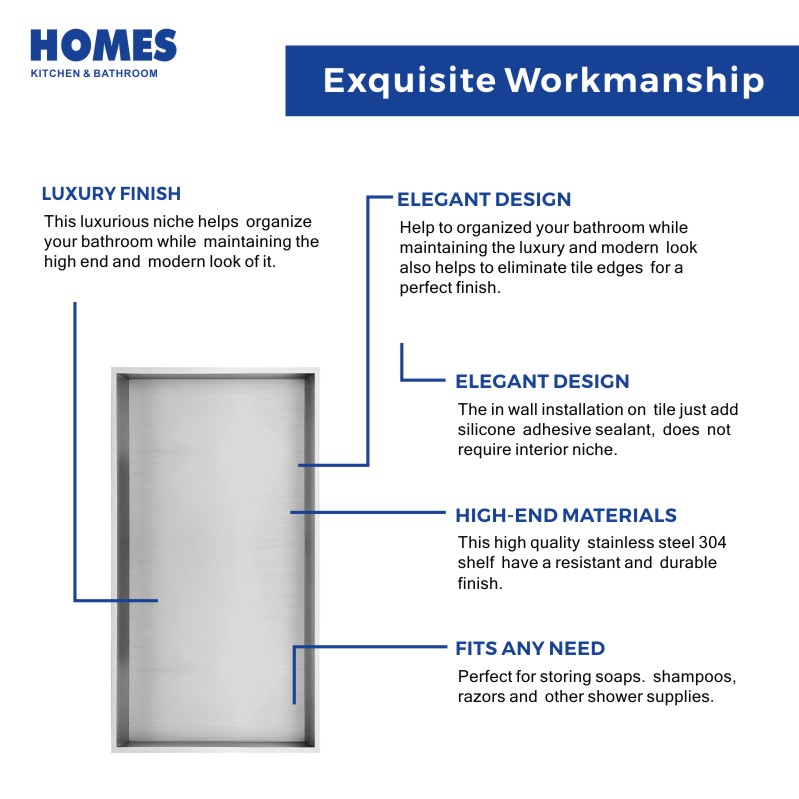 Meticulously forged from premium stainless steel, this shower niche boasts superior durability, rustproof integrity, and waterproof resilience, engineered to thrive in moisture-laden bathrooms and stand the test of time.