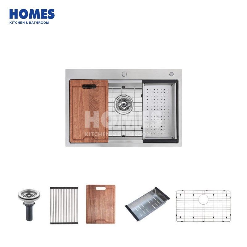It is equipped with practical accessories such as a drain assembly and a protective bottom grid. The drain assembly can prevent water accumulation and clogging problems. The protective bottom grid can not only reduce the risk of the sink bottom being scratched but also reduce the noise generated by the collision between tableware and the sink.